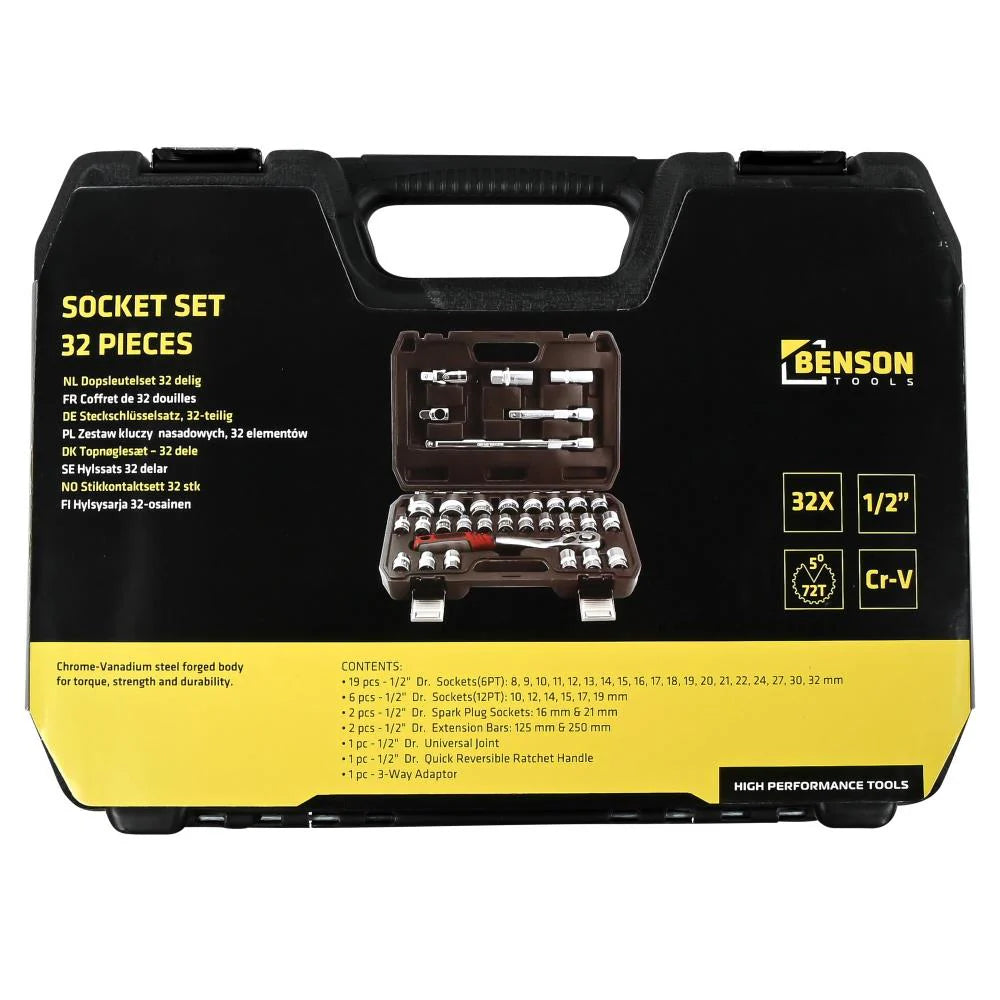 Zoek je een degelijke 1/2” doppenset voor zwaardere klussen? Deze 32-delige set biedt een complete selectie doppen en accessoires waarmee je direct aan de slag kunt.